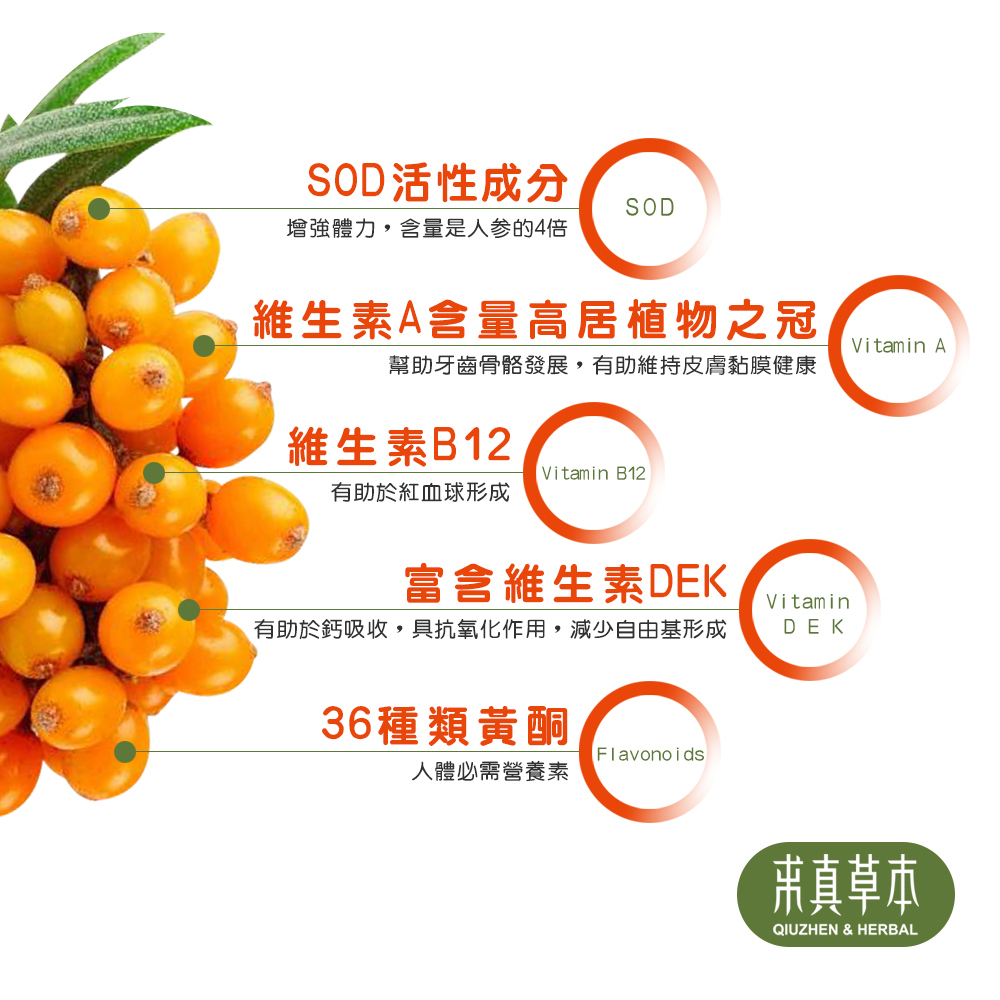 生命之黃金果、含數百種有益人體健康的成份,保健效果佳,含不飽和脂肪酸Omega7。沙棘是既可食用,又可藥用,營養價值頗高、臨牀治療效果顯著的天然藥用植物。前蘇聯學者研究發現沙棘果實中活性成分已達190多種,油中的活性成分有106種。